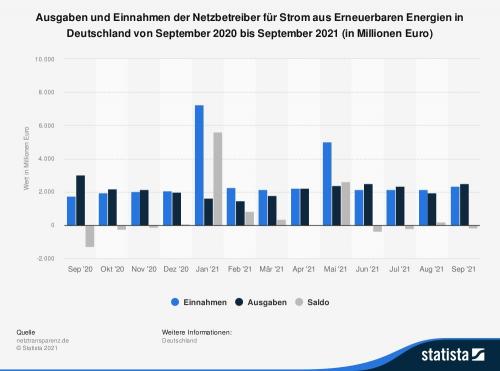 Die Statistik veranschaulicht die Ausgaben und Einnahmen der Übertragungsnetzbetreiber für Strom aus erneuerbaren Energien in Deutschland von September 2020 bis September 2021. Im September 2021 betrugen demnach die Einnahmen aus der Umlage nach dem Erneuerbare-Energien-Gesetz (EEG) sowie aus den Verkaufserlösen für Ökostrom rund 2,3