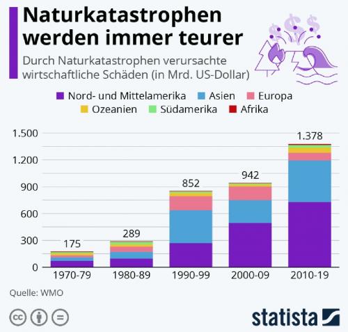 Auf rund 1.400 Mrd. US-Dollar beziffert die World Meteorological Organization (WMO) die zwischen 2010 und 2019 weltweit durch Naturkatastrophen verursachten wirtschaftlichen Schäden. Davon entfällt der Löwenanteil auf Nord- und Mittelamerika (728 Mrd. US-Dollar). Aber auch in Europa belaufen sich die Schäden auf fast 87 Milliarden US-Dollar. Auch die Zahl der Naturkatastrophen ist im 21. Jahrhundert laut WMO deutlich gestiegen.