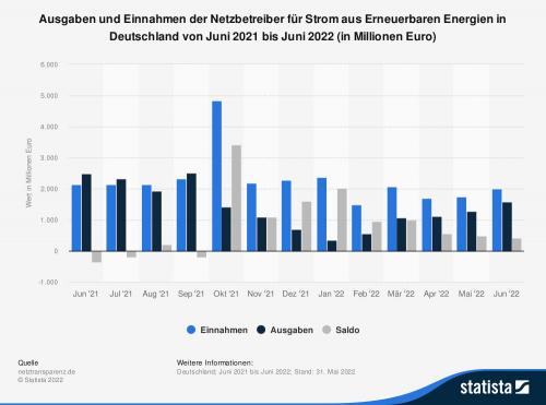 Die Statistik zeigt die Ausgaben und Einnahmen der Netzbetreiber für Strom aus erneuerbaren Energien in Deutschland von Juni 2021 bis Juni 2022 nach Zahlen von netztransparenz.de. Im Juni 2022 betrugen die Einnahmen aus der Umlage nach dem Erneuerbare-Energien-Gesetz sowie aus den Verkaufserlösen für Ökostrom rund 2