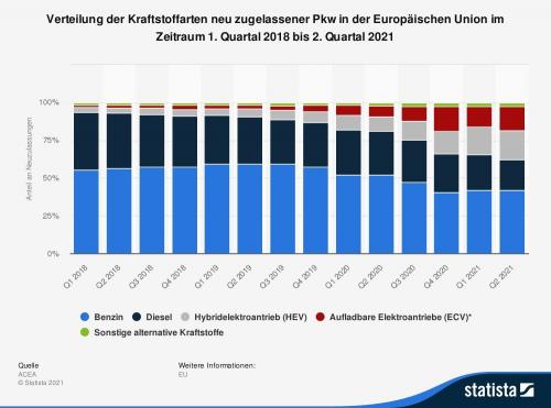 European Automobile Manufacturers’ Association (ACEA) tendenziell rückläufig und lag im zweiten Quartal des Jahres 2021 bei 20,4 %. Zuwächse konnten bei den Autos mit Elektro- und Hybridantrieb verzeichnet werden.