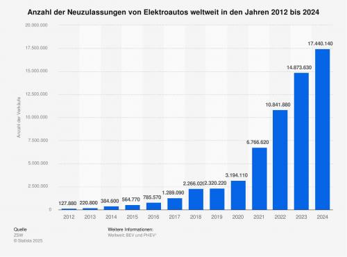 Die Zahl der Neuzulassungen von Elektroautos nimmt seit 2012 kontinuierlich zu. Im Jahr 2024 wurden weltweit rund 17,4 Millionen E-Autos verkauft. Insgesamt waren im Jahr 2024 etwa 55,8 Millionen E-Autos weltweit zugelassen, darunter über die Hälfte in China.