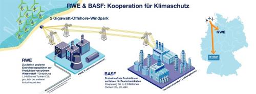 Schematische Darstellung der Kooperation zwischen Nordsee-Windpark und BASF Zur Vollansicht bitte auf die Grafik klicken Grafik: RWE |