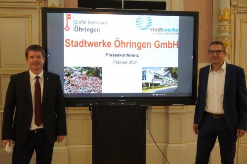 Gebhard Gentner, Geschäftsführer der Stadtwerke Schwäbisch Hall (rechts), und Öhringens Oberbürgermeister Thilo Michler freuen sich über den wegweisenden Gemeinderatsbeschluss Bild: Stadtwerke Schwäbisch Hall |