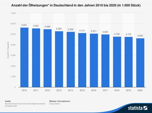 Im Jahr 2020 befanden sich rund 4,6 Mio. Ölheizungen in Deutschland in Betrieb. Die Anzahl der Ölheizungen ging in den vergangenen Jahren kontinuierlich zurück. Zuletzt wurden die meisten Wohngebäude hierzulande mit Erdgas beheizt. In neu erbaute Wohnungen wurden ebenso überwiegend Heizungssysteme mit Erdgas installiert.