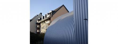 Was Wärmewende in einer Großstadt wie Dortmund heißt, wird beim Gang um die Energiezentrale sichtbar: Die nächsten mehrstöckigen Wohnhäuser sind keine zehn Meter entfernt. Auch wenn die neue Energiezentrale mit ihrer Aluminiumverkleidung von der Höhe nicht besonders auffällt, hebt sich der Neubau architektonisch deutlich ab: Das Gebäude wirkt wie eine kleine, kompakte Kathedrale. Was fehlt, ist ein Kreuz an der Spitze.
