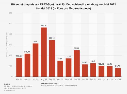 Im Mai 2023 betrug der durchschnittlich gehandelte Preis für Strom im Marktgebiet Deutschland/Luxemburg rund 82 Euro pro Megawattstunde und lag damit deutlich tiefer als ein Jahr zuvor. Grund für die dramatisch gestiegenen Kosten während des Jahres 2022 ist der akute Erdgasmangel auf Grund des russischen Angriffskrieges und die damit einhergehenden Preisesteigerungen. Im Oktober 2018 änderte sich das Marktgebiet von Deutschland/Österreich zu Deutschland/Luxemburg.
