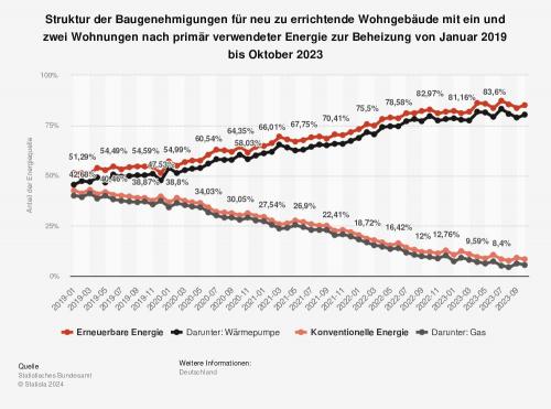 Prozent. Die mit etwa 80 Prozent aller erteilten Genehmigungen am häufigsten vorgesehene erneuerbare Energiequelle ist die Wärmepumpe. Erdgas dagegen, die am meisten genutzte konventionelle Energiequelle, wurde im Oktober 2023 in nur 5,5