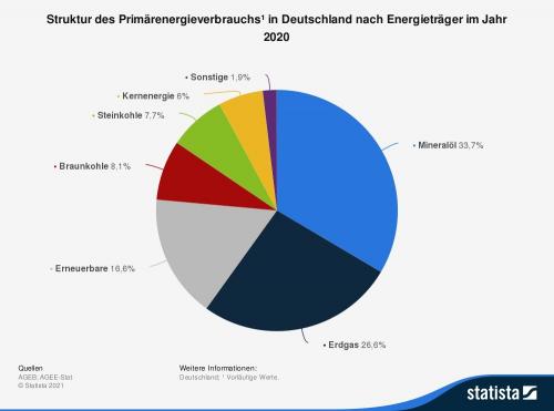 Die Statistik zeigt die Verteilung des Primärenergieverbrauchs in Deutschland nach Energieträger im Jahr 2020. Der Primärenergieverbrauch ergibt sich aus der Gewinnung primärer Energieträger im Inland, den Importen sowie aus Bestandsentnahmen. Im Jahr 2020 betrug der Anteil erneuerbarer Energien am Primärenergieverbrauch in Deutschland 17 %. Insgesamt wurden rund rund 11,8 Exajoule Primärenergie verbraucht.