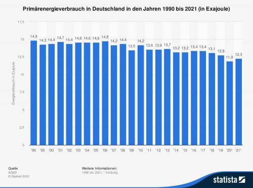 Die Statistik bildet auf Basis von Daten der Arbeitsgemeinschaft Energiebilanzen (AGEB) den Primärenergieverbrauch in Deutschland in den Jahren 1990 bis 2021 ab. Als Primärenergie gelten Brennstoffe wie Kohle oder Erdgas, aber auch Energieträger wie Sonne, Wind oder radioaktive Erze. Der Primärenergieverbrauch ergibt sich aus der Gewinnung primärer Energieträger im Inland, den Lieferungen über die Landesgrenzen sowie aus Bestandsentnahmen. Im Jahr 2021 betrug der Primärenergieverbrauch in Deutschland 12,3