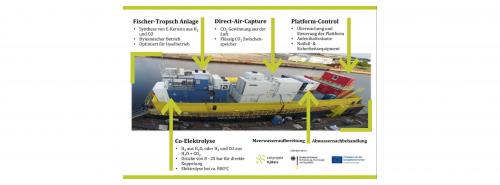 Direkt an Bord der Plattform erzeugt das Forschungsteam grünen Wasserstoff, indem es entsalztes Seewasser per Hochtemperatur-Elektrolyse in Wasserstoff und Sauerstoff aufspaltet. Die Plattform nutzt dafür ausschließlich Strom aus erneuerbaren Quellen, der in einer späteren Ausbaustufe direkt von Offshore-Windkraftanlagen stammen soll.