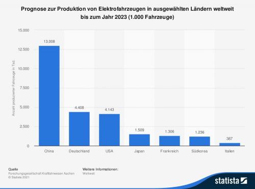 Die Statistik zeigt eine Prognose der Anzahl produzierter Elektroautos in ausgewählten Ländern weltweit bis zum Jahr 2023. So wird davon ausgegangen, dass bis dahin insgesamt rund 4,4 Mio. Elektrofahrzeuge in Deutschland produziert werden.