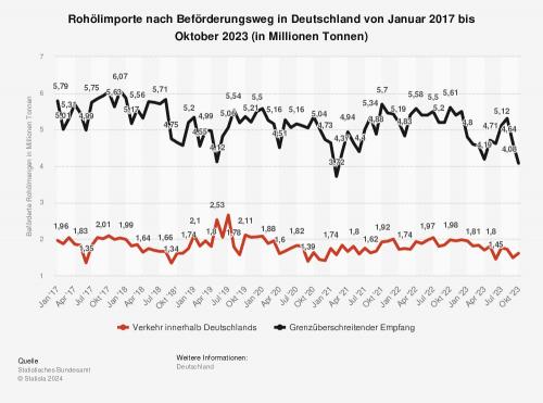 Die Statistik zeigt die Rohölimporte nach Beförderungsweg in Deutschland von Januar 2017 bis Oktober 2023 nach Zahlen des Statistischen Bundesamts. Im Oktober 2023 wurden innerhalb Deutschlands rund 1,61