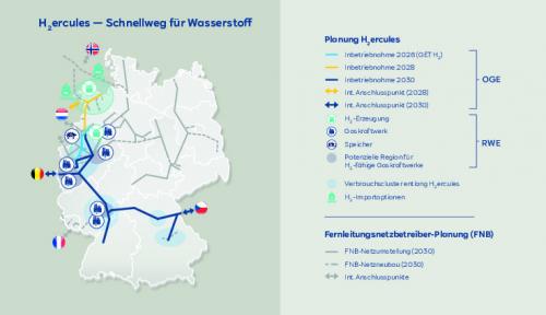 in deutschem Boden – realisieren. Da der größte Teil ihres Projektes "H2ercules" auf der Umstellung bereits bestehender Erdgasleitungen basiert, sei das Konzept in Summe kostengünstiger und deutlich schneller umsetzbar als ein kompletter Neubau reiner Wasserstoffleitungen, heißt es seitens der Unternehmen. Als Investitionssumme geben sie 3,5