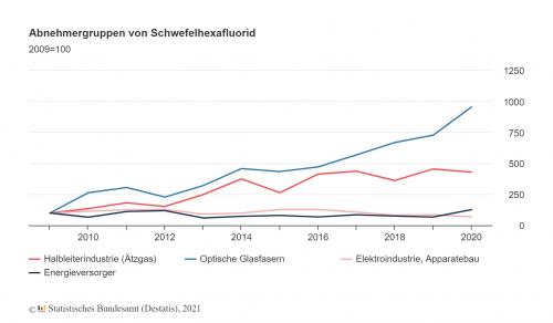 Die Entwicklung des Absatzes von SF6 in Deutschland seit 2009. Die Grafik zeigt keine absoluten Absatzzahlen, sondern die relative Entwicklung in den verschiedenen Bereichen ausgehend von einem gemeinsamen Ausgangspunkt. Zur Vollansicht bitte auf die Grafik klicken Quelle: Destatis |