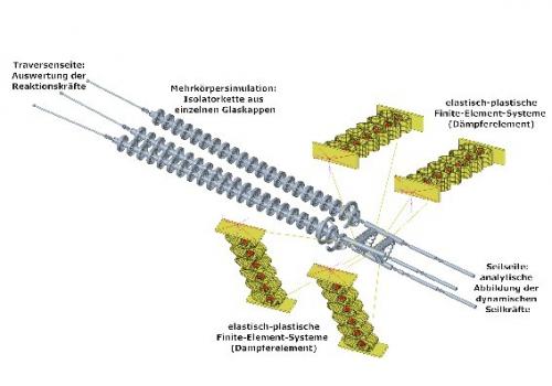Einerseits wurden die Seildynamik und das Bewegungsverhalten der Isolatorenstränge modelliert. Andererseits wurde die plastische Verformung des Dämpferelements abgebildet.