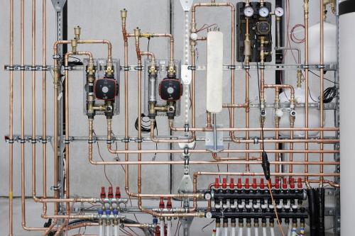 Sonnenwärme heizt Beton auf. Wie sich diese Wärme effizient für die Gebäudeheizung nutzen lässt, hat eine Arbeitsgruppe von Prof. Matthias Pahn an der Technische Universität Kaiserslautern (TUK) untersucht. Ergebnis ist ein Heizsystem mit neuartigen Bauteilen, die ihre eigene Masse als Wärmespeicher nutzen. Die Steuerung (Foto) ist jedenfalls eine anspruchsvolle Angelegenheit. Die Wärmeerzeuger (schwarz, rechts oben), Speicher und Heizflächen (Mitte) werden über Umwälzpumpen geregelt. Einzelne Ventile (rot, unten) ermöglichen das präzise Dosieren von Be- und Entladevorgängen.
