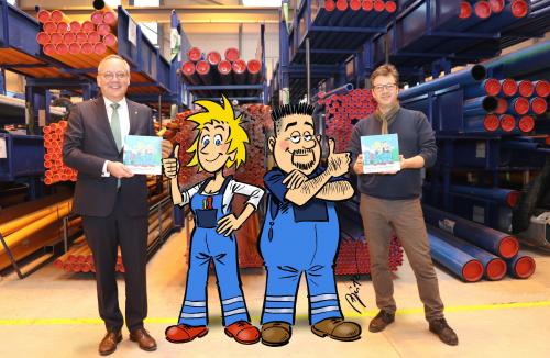 Seit 2011 klären die beiden Comicfiguren „Elektro Susi und Wasser Eddi“ (kurz ESWE) die Leser im Kundenmagazin Visavis des Wiesbadener Versorgers ESWE über die Aufgaben von Stadtwerkern auf. Über 40 Kurzgeschichten sind seitdem zusammengekommen. Zum Jubiläum erscheinen deren Abenteuer nun erstmals gesammelt in Buchform. Darüber hinaus sind die Figuren anderweitig präsent: „Das Konterfei von Susi und Eddi schmückt inzwischen Brotdosen, Kochschürzen oder Weihnachtskarten. Es gibt sie als gerahmtes Bild und als Knautschfiguren“, heißt es aus Wiesbaden. Erschaffen wurden Elektro Susi und Wasser Eddi von dem bekannten Zeichner und Maler Michael Apitz. Das Bild zeigt Apitz (rechts) und ESWE-Vorstandschef Ralf Schodlok (links) gemeinsam mit Eddi (2. von rechts) und Susi im ESWE-Lager an der Konradinerallee in Wiesbaden.