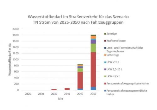 - Bedarf insgesamt: Die jährliche Wasserstoffnachfrage steigt bis zum Jahr 2030 auf rund 900 Tonnen pro Jahr und nimmt dann stetig zu: bis 2040 auf rund 4.800 Tonnen und bis 2050 auf rund 6.900 Tonnen.