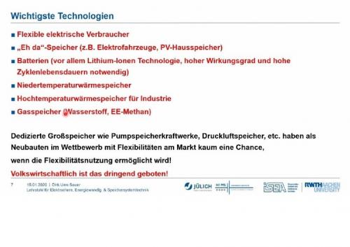 Ein Zusammenspiel von Lastmanagement, physikalischen Speichern und Sektorkopplung werde derzeit durch den gesetzlichen Rahmen der alten, zentralen Energiewelt massiv behindert, stellten die Experten fest. Dirk Uwe Sauer, Professor für Elektrochemische Energieumwandlung und Speichersystemtechnik an der RWTH Aachen sagte, dass die Verknüpfung des Stromsektors mit dem Wärmebereich, der Erzeugung von Gas (zum Beispiel Wasserstoff) und der Nutzung in Verkehr und Industrie nicht unbedingt viele teure Speicher nötig mache.