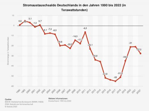 Der Stromaustauschsaldo Deutschlands betrug nach Zahlen des BDEW im Jahr 2022 rund -27,5
