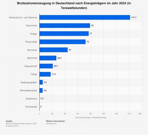 Die Statistik zeigt die Bruttostromerzeugung in Deutschland nach Energieträgern im Jahr 2024. Durch Wasserkraft wurden im Jahr 2024 in Deutschland laut vorläufigen Angaben rund 21 Terawattstunden Strom erzeugt.