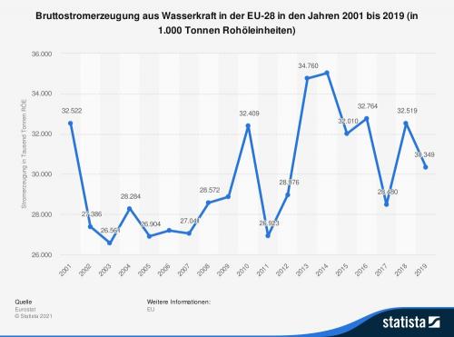 Die Statistik zeigt die Entwicklung der Bruttostromerzeugung aus Wasserkraft in der EU-28 in den Jahren 2001 bis 2019. Im Jahr 2019 wurden in den 28 Ländern der Europäischen Union insgesamt rund 30 Millionen Tonnen Rohöleinheiten Bruttostrom aus dem erneuerbaren Energieträger Wasserkraft erzeugt.