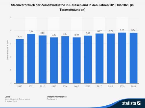 Die vorliegende Statistik zeigt die Entwicklung des Stromverbrauchs der Zementindustrie in Deutschland in den Jahren 2010 bis 2020. Im vergangenen Jahr verbrauchte die deutsche Zementindustrie rund 3,84 Milliarden kWh Strom, so der Verein Deutscher Zementwerke.