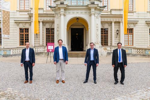 Nach der Vertragsunterzeichnung vor dem Residenzschloss Ludwigsburg (v.l.): Johannes Rager (SWLB), OB Matthias Knecht, Thilo Höllen (Telekom) und Christian Schneider (SWLB) Quelle: SWLB/Daniel Döbler |