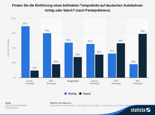 % der Befragten diese potenzielle Maßnahme als richtig. Sowohl Anhänger der Grünen als auch der SPD und der Union sprachen sich mehrheitlich für ein solches Tempolimit aus.