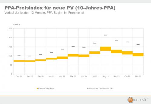 Für zehnjährige PPA, um neue Photovoltaik-Freiflächenanlagen zu errichten, ergaben sich Preise von knapp unter 100 bis 115 Euro/MWh. Der damit korrespondierende Terminmarkt-Mischpreis lag im November-Schnitt bei 162 Euro/MWh. Im Oktober (wir berichteten) war mit 108 bis 125 Euro/MWh PPA-Preis nur wenig mehr erzielbar gewesen, während es bei Ü20-Windanlagen noch zwischen 30 und 40 Euro/MWh mehr gewesen waren.
