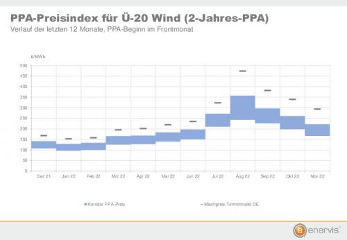 Auf die Marktpreis-Bandbreiten von PPA kommen die Analysten von Enervis so: Sie nehmen vom ermittelten durchschnittlichen Preis der jeweils einschlägigen Terminmarkt-Lieferprodukte auf dem Graustrom-Terminmarkt der Börse EEX − dem Dreh- und Angelpunkt für die Bepreisung dieser langfristigen Direktlieferverträge − verschiedene Ab- und Zuschläge vor:
