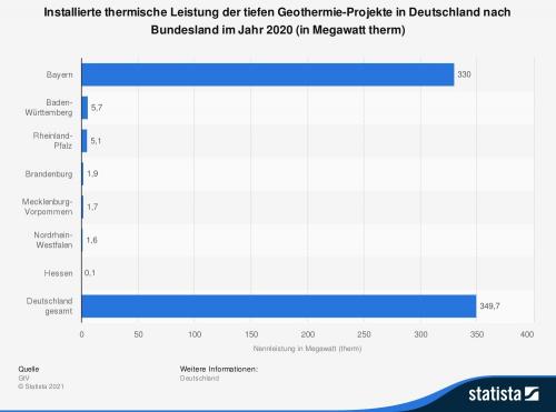 Die Statistik zeigt auf Basis von Daten des Bundesverbandes Geothermie die installierte thermische Leistung der tiefen Geothermie-Projekte in Deutschland nach Bundesland. Im Jahr 2020 betrug die installierte Leistung der Geothermieanlagen zur Wärmeerzeugung demnach in Mecklenburg-Vorpommern rund 1,7 MW.
