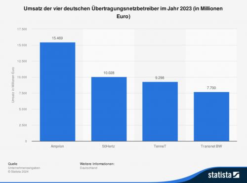 Die Statistik vom Juli 2024 zeigt den Umsatz der vier deutschen Übertragungsnetzbetreiber im Jahr 2023. Die Übertragungsnetzbetreiber sind für die Infrastruktur der überregionalen Stromnetze verantwortlich. Im Jahr 2023 erwirtschaftete Tennet Deutschland einen Umsatz in Höhe von rund 9,3 Milliarden Euro.