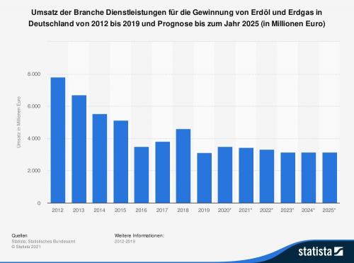 Die Statistik zeigt den Umsatz der Branche Erbringung von Dienstleistungen für die Gewinnung von Erdöl und Erdgas in Deutschland in den Jahren von 2012 bis 2019 sowie eine Prognose von Statista bis zum Jahr 2025. Laut der Vorhersage wird der Umsatz im Jahr 2025 rund 3.149 Mrd. Euro betragen.