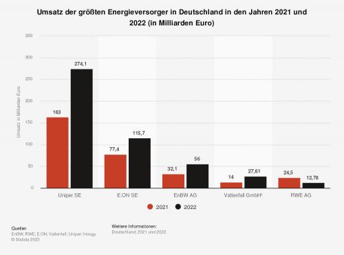 Milliarden Euro auf Rang 1 der größten Energieversorger Deutschlands. Uniper entstand durch die Abspaltung verschiedener Sparten des Energieerzeuger Eon, das Unternehmen mit dem zweitgrößten Umsatz in 2022, und ist heute eine börsennotierte Gesellschaft.