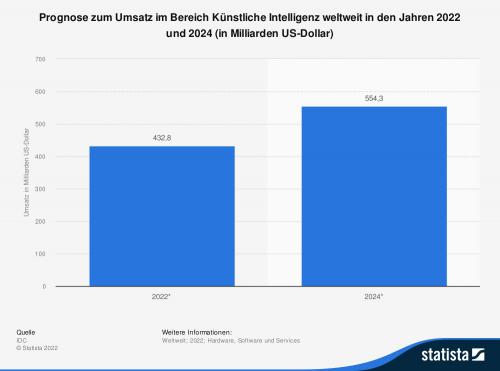 Der weltweite Umsatz im Bereich Künstliche Intelligenz in den Anwendungsfeldern Hardware, Software und IT-Services könnte sich laut Prognose der International Data Corporation (IDC) im Jahr 2024 auf rund 554,3