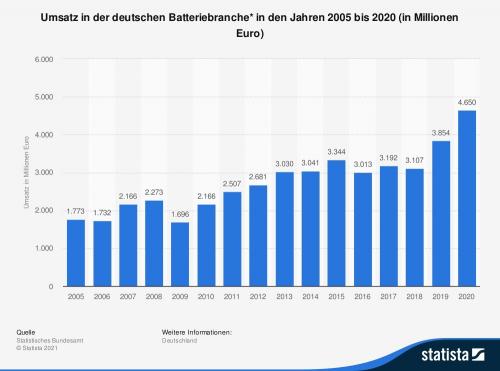 Die Statistik zeigt die Umsatzentwicklung in der deutschen Batteriebranche* in den Jahren 2005 bis 2020. Im Jahr 2020 erwirtschafteten die deutschen Hersteller laut Zahlen des Statistischen Bundesamtes einen Umsatz in Höhe von rund 4,7 Milliarden Euro. (* Genaue Bezeichnung des Statistischen Bundesamtes: "Herstellung von Batterien und Akkumulatoren")