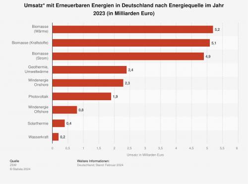 Die Statistik zeigt den Umsatz mit erneuerbaren Energien in Deutschland nach Energiequelle im Jahr 2023 nach Zahlen des Zentrums