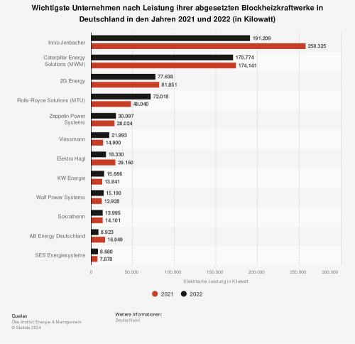 Die Statistik zeigt die wichtigsten Unternehmen nach Leistung ihrer abgesetzten Blockheizkraftwerke in Deutschland in den Jahren 2021 und 2022 nach Zahlen des Ökoinstituts und von
