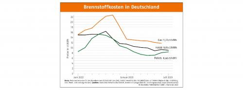Brennstoffkosten für Gas, Heizöl und Pellets in Deutschland im Jahresverlauf (Stand: Juli 2023). Zum Vergrößern bitte auf die Grafik klicken Quelle: DEPI |
