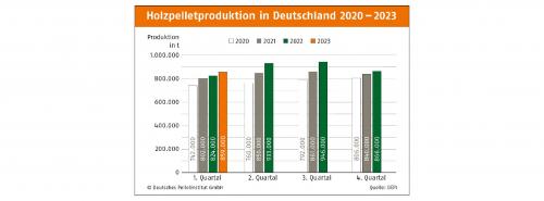 Pelletproduktion in Deutschland 2020 bis 2023 pro Quartal. Zum Vergrößern bitte auf die Grafik klicken Quelle: Depi |