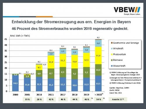 Erfolg" sieht der Verband, dass knapp die Hälfte des in Bayern benötigten Stroms aus heimischen Erneuerbare-Energien-Anlagen gedeckt wurde. Dabei gehe man vereinfacht davon aus, dass jede in Bayern erzeugte Kilowattstunde auch zeitgleich wieder im Bundesland verbraucht wird, was physikalisch nicht für alle Stunden im