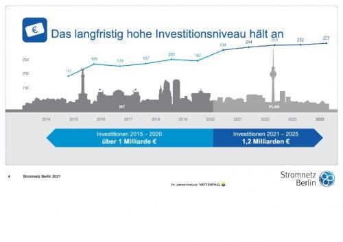 Investitionen in Erhalt, Modernisierung und DigitalisierungZum laufenden Jahr hatte Stromnetz Berlin die Netzentgelte auf 6,47 Ct/kWh erhöht, zuvor waren es 5,85 Cent/kWh. Rund die Hälfte der Investitionen für 2021 soll in den Erhalt sowie die Modernisierung des bestehenden Stromnetzes fließen. Weitere rund 80 Mio. Euro sind laut Schäfer für neue Infrastrukturen in der Stadt vorgesehen, etwa den Aufbau von Datenzentren für Unternehmen oder Ladepunkten für Elektroautos. Bis 2025 plant das Unternehmen mit Investitionen von bis zu 257 Mio. Euro.