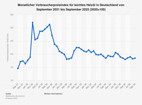 Im September 2025 lag laut dem Statistischen Bundesamt der Verbraucherpreisindex für leichtes Heizöl in Deutschland bei einem Wert von 184,7
