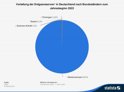 Die Statistik zeigt die Verteilung der Erdgasreserven in Deutschland nach Bundesländern zum Jahresbeginn 2022. Die Gesamtmenge der sicheren und wahrscheinlichen Erdgasreserven belief sich zum 1. Januar 2022 deutschlandweit auf insgesamt rund 42,2 Milliarden Kubikmeter Rohgas. Sachsen-Anhalt hielt davon einen Anteil von rund 0,3 Prozent. Quelle: LBEG