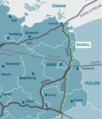 In Lubim stehen damit drei Leitungen zum Abtransport des Nord-Stream-Gases zur Verfügung: die „Nordeuropäische Erdgasleitung“ (NEL), die über Hamburg und Bremen Richtung Westen verläuft, die „Ostsee-Pipeline-Anbindungsleitung“ (Opal) und die Eugal. Der Verlauf der beiden letztgenannten Leitungen verläuft mehr oder weniger parallel Richtung Tschechien.