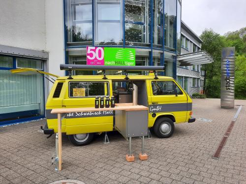 Jahre lang war der VW-Bus der „Bulli-Generation“ als Kabelmesswagen im Einsatz. Mithilfe seiner eingebauten Ausstattung wurden Kabelstörungen lokalisiert, um Schäden an der richtigen Stelle zu beheben. Anstatt das Fahrzeug auszumustern und zu verschrotten, haben die Schwäbisch Haller Stadtwerke den Bulli von der Firma Classic Foodtrucks aus dem ostwürttembergischen Böbingen an der Rems zum Promotion- und Eventfahrzeug umbauen lassen − anlässlich des 50-jährigen Bestehens der Stadtwerke.