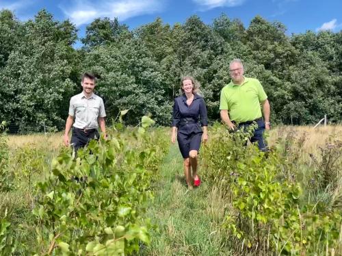 Hektar große Fläche wird von den SHLF zur Verfügung gestellt. Cornelia La Loggia, Bereichsleiterin Vertrieb bei dem Stadtwerk, schreitet auf dem Foto mit Jan Meyer-Hamme (links) und Sebastian Lange-Haffmans (beide SHLF) die Setzlinge ab, vor allem Stieleiche, Spitzahorn und Roterle. Das Geld stammt aus dem Umweltfonds des Kommunalversorgers, in den Kunden von Ökostrom- und -Gastarifen freiwillig einzahlen. La Loggia: "So pflanzen unsere Kunden Bäume bequem von zuhause aus." Das waldärmste Bundesland will seine Waldfläche von 11