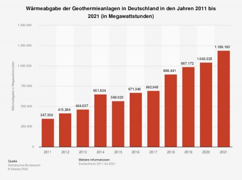 Die Statistik zeigt die Entwicklung der Wärmeabgabe der Geothermieanlagen in Deutschland in den Jahren 2011 bis 2021 nach Zahlen des Statistischen Bundesamtes. Im Jahr 2021 wurden in Deutschland 1,189