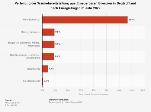 Die Statistik zeigt die Verteilung der Wärmebereitstellung aus erneuerbaren Energien in Deutschland nach Energieträger. Im Jahr 2022 wurden zum Beispiel rund 4,4